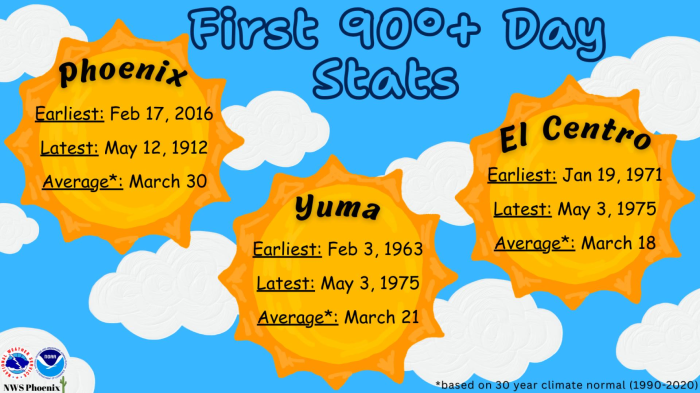 The average first 90° for all three of our climate sites occurs in mid to late March. However, the earliest 90° for all of the climate sites has already passed. So even though we're forecasting for all three sites to reach 90°+ by the end of the week it won't be the earliest occurrence.